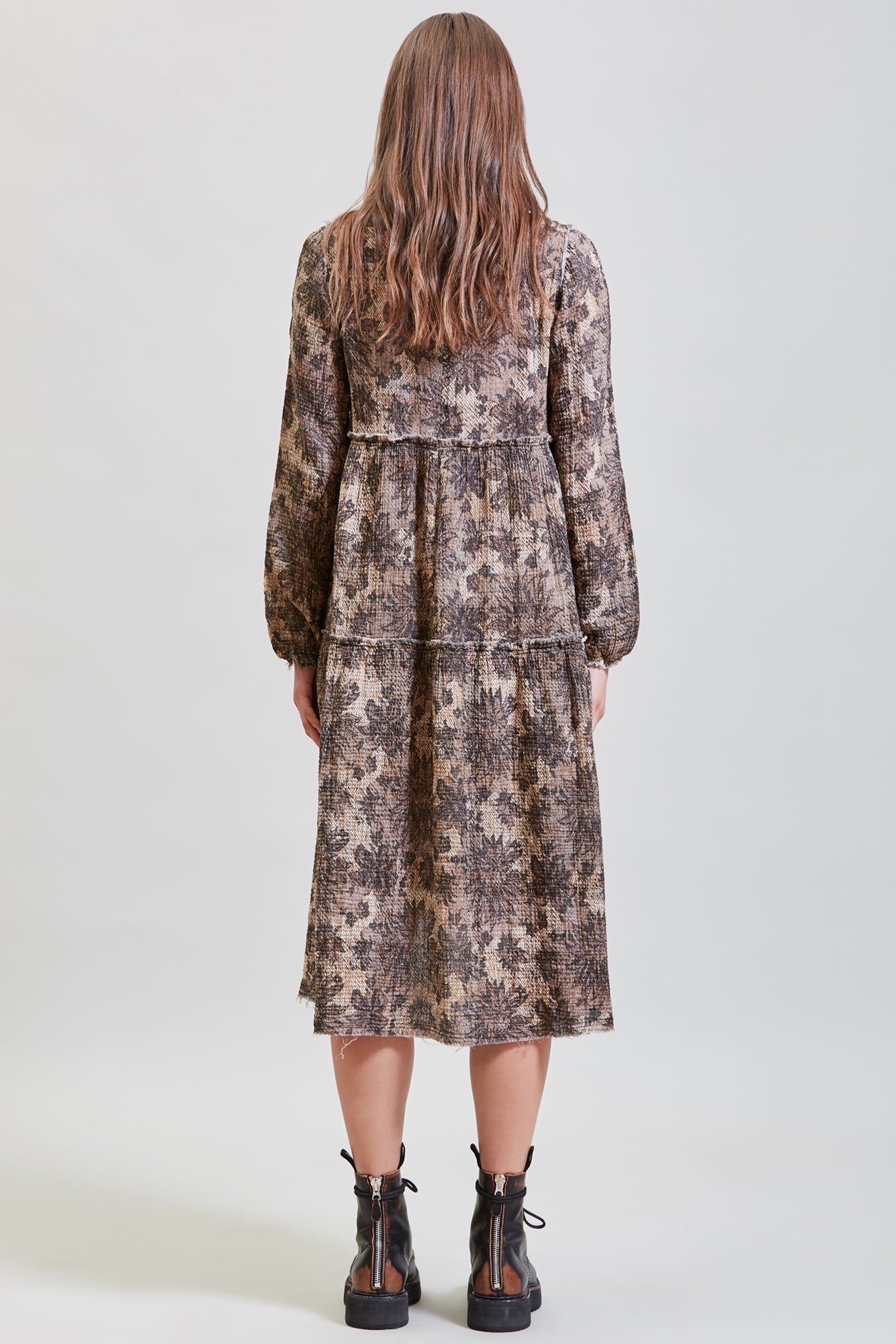 Long sleeve midi length babydoll dress made with Italian crinkle lace printed cotton gauze. Shredded at seam and raw hems for a deconstructed look.