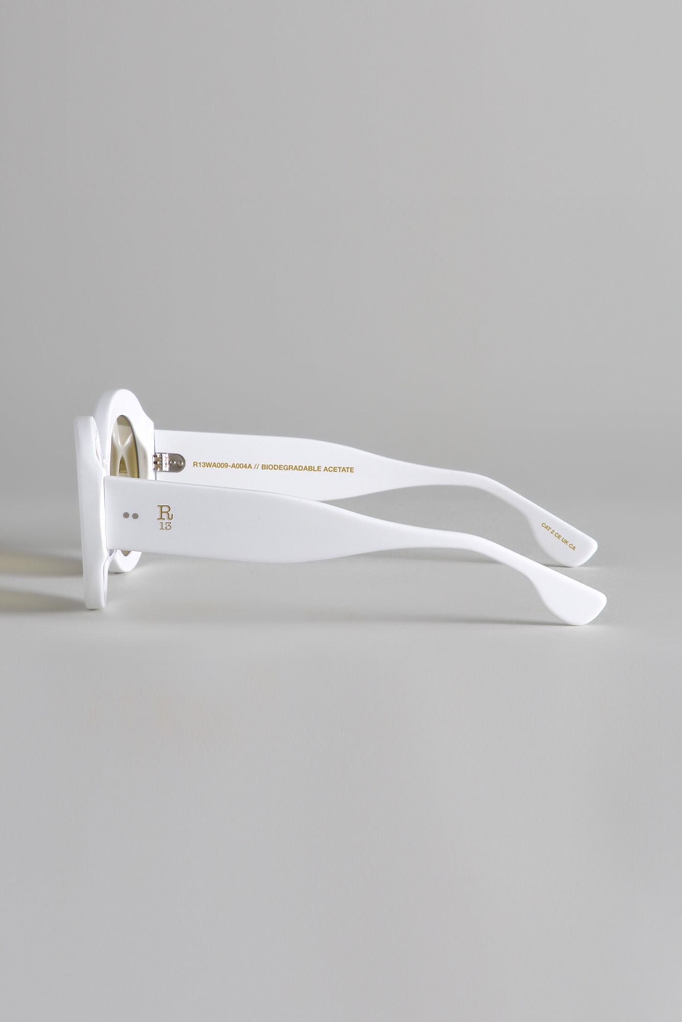 Classic white oval frame sunglasses with yellow lenses. This style's bio-acetate frames and bio-nylon lenses form a cohesive eco-friendly pair of sunglasses. Features German-made 5-barrel hinges that limit metal-on-metal corrosion and an F.U. inscription on the interior.