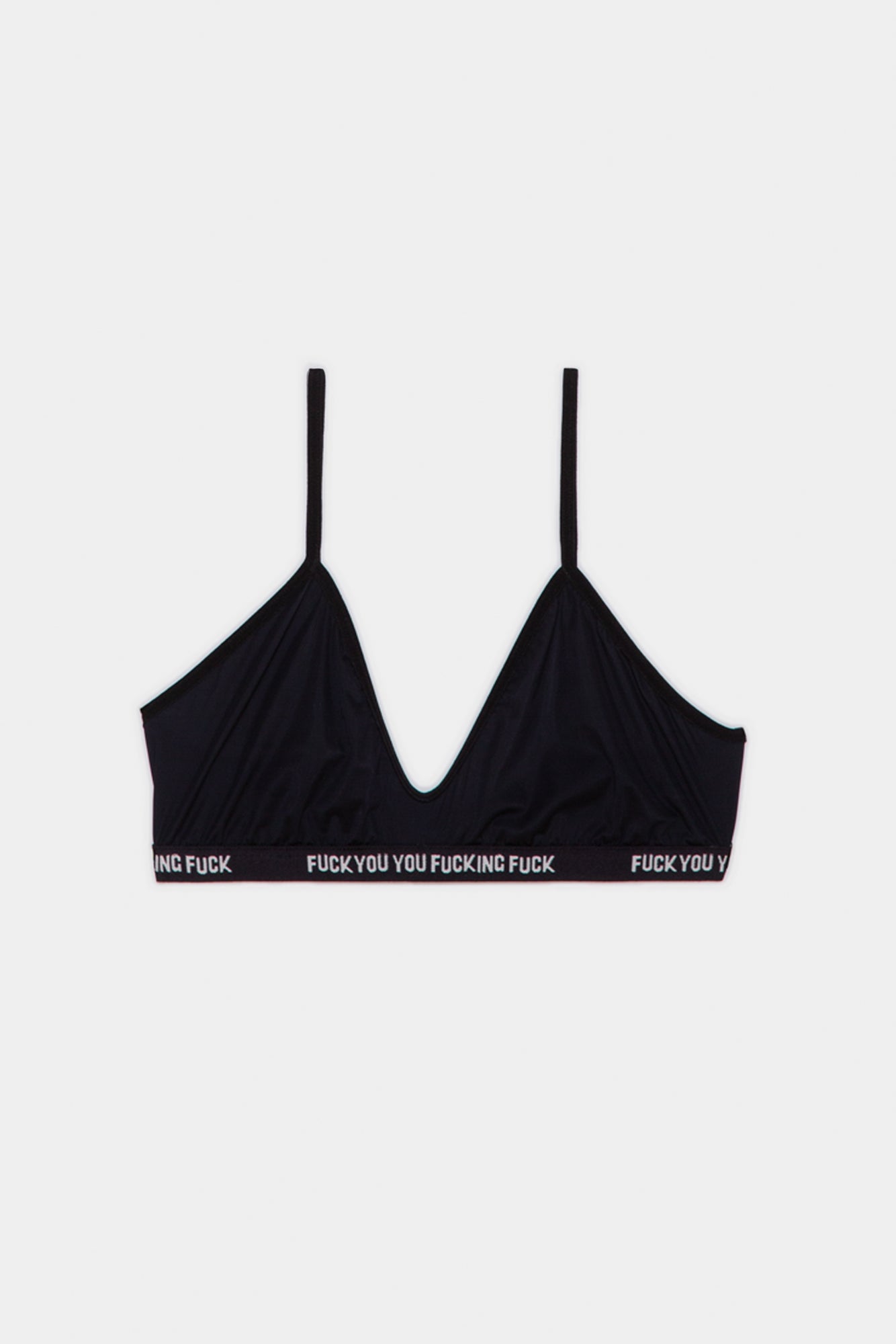 This is a USA-made classic bralette with matte micro nylon. Designed with triangle cups and a black-and-white FYYFF waistband.