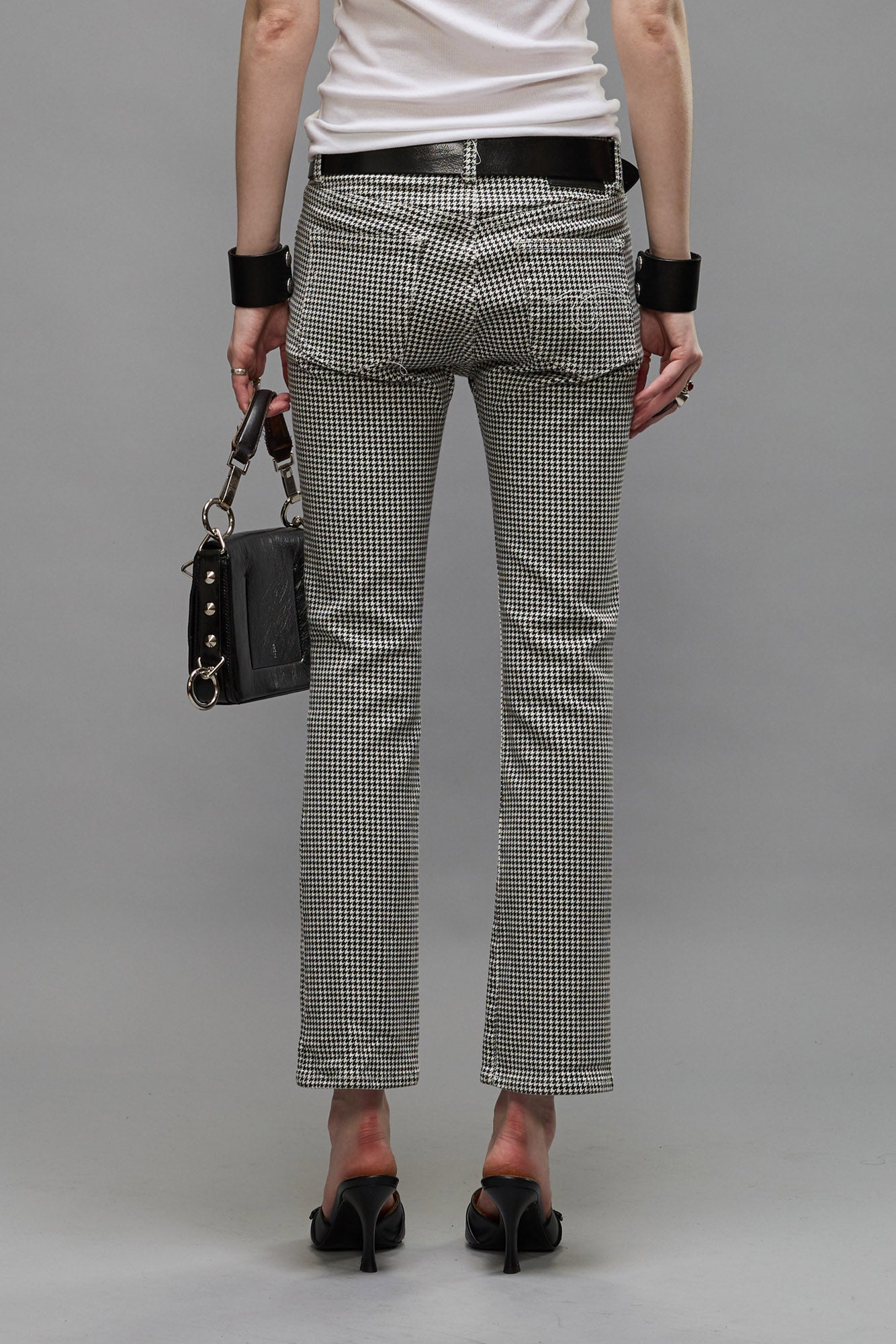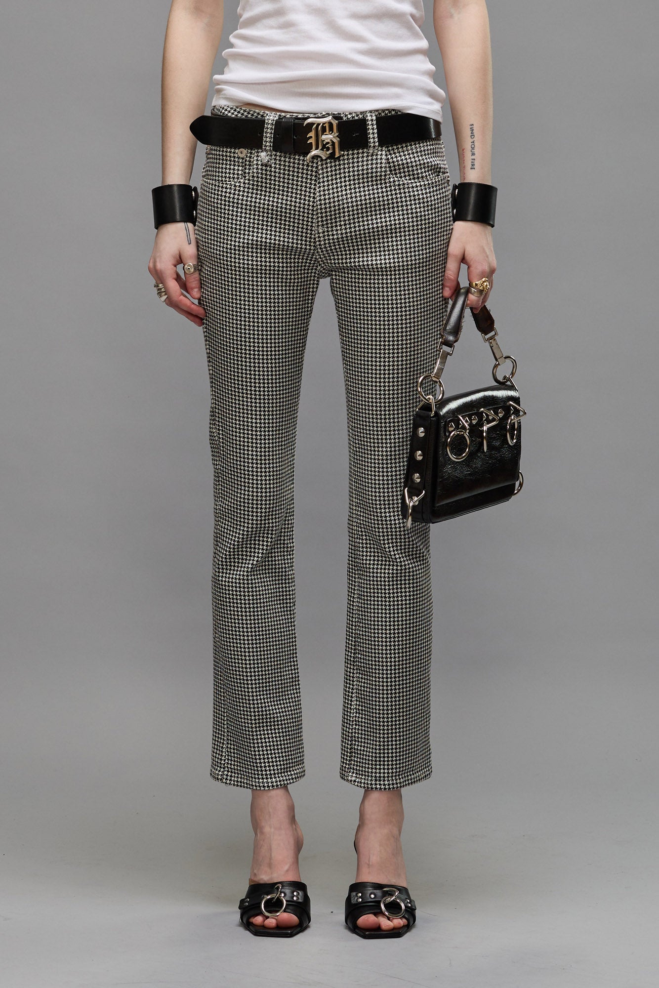 R13's iconic slim-fit Boy Straight featuring a low rise and slim straight cropped leg. Built with printed Japanese houndstooth stretch denim.