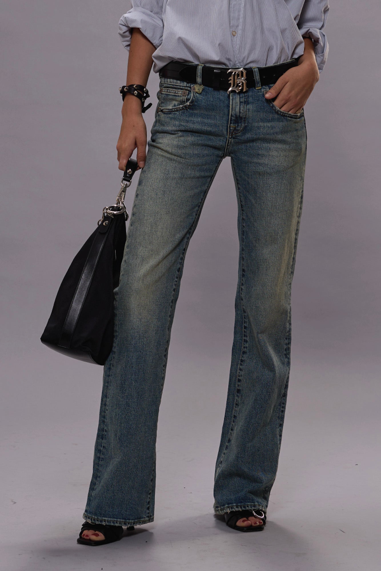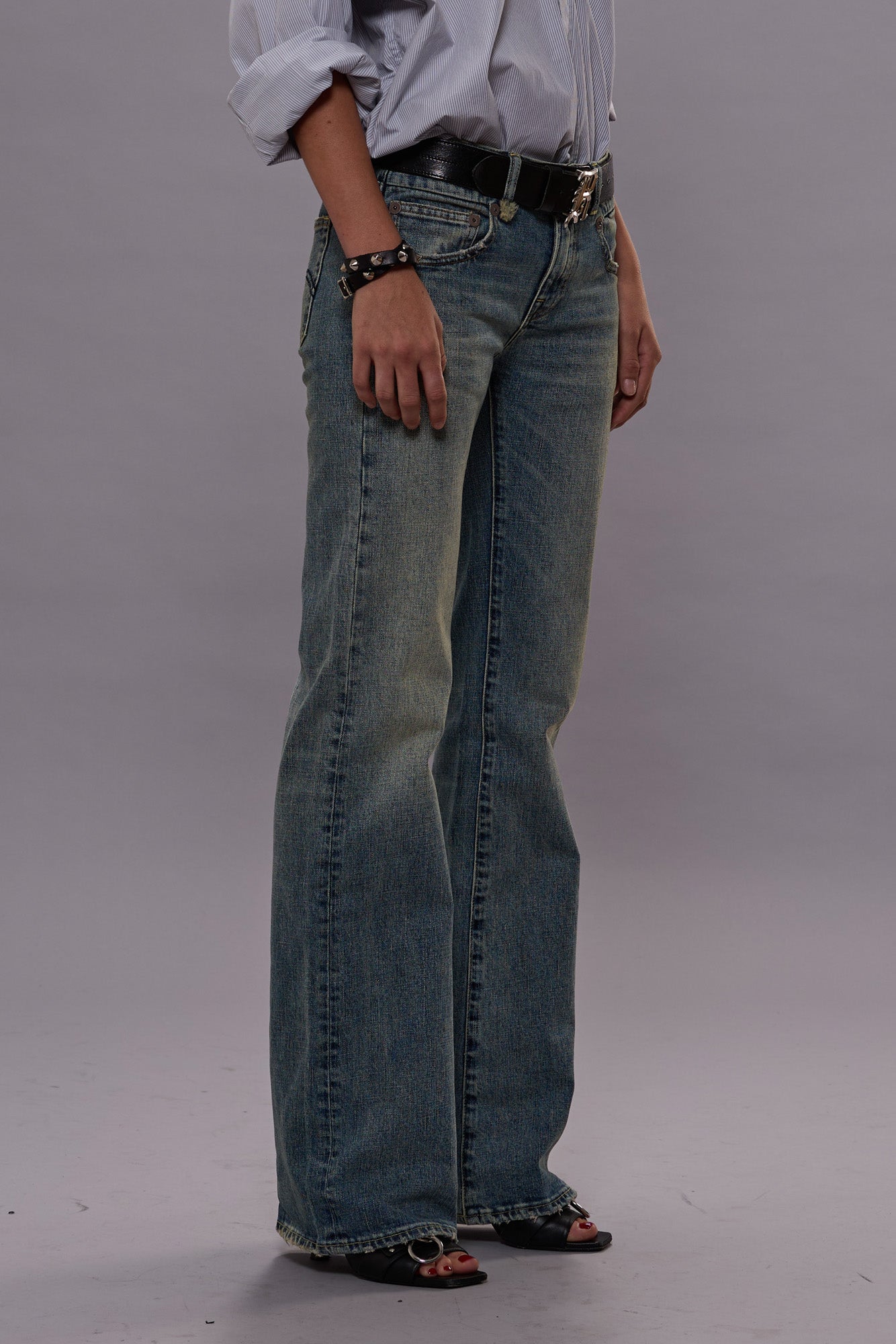 The Boy Flare is a fitted low-rise jean at the top that flares out at the leg for a dynamic silhouette. Built with mid-weight Japanese blue stretch denim and treated with a medium light blue wash, heavy wear, and warm tinting.