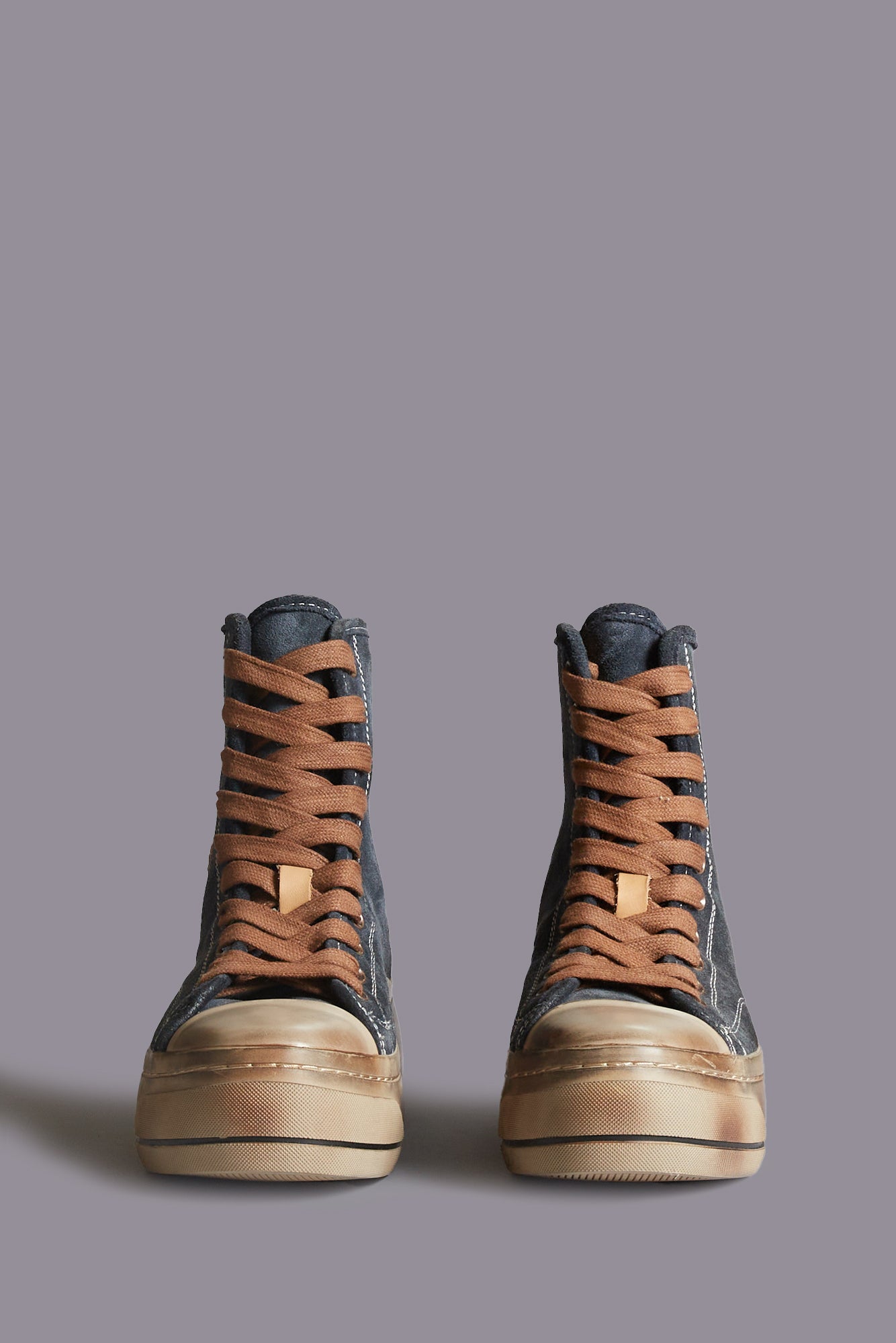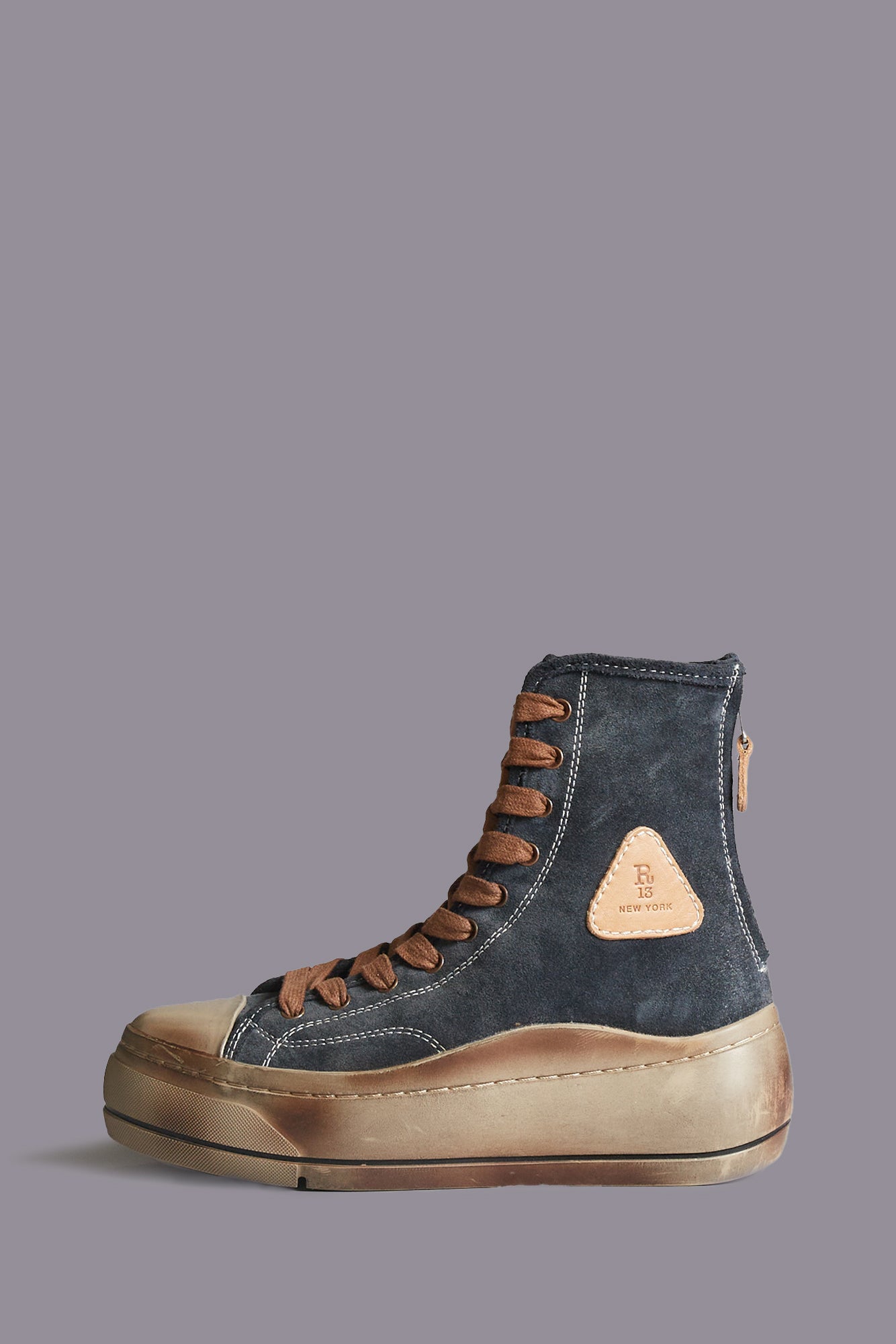 A twist on R13's iconic Kurt High Top Sneaker, featuring an extended top and a washed navy suede construction.