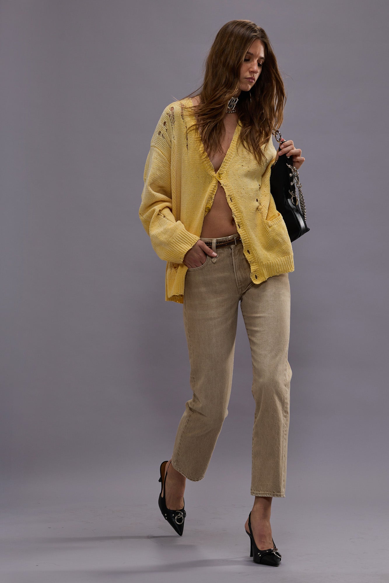 Slim variant of the classic Boyfriend Jean, built with yarn dyed Japanese rigid khaki denim with a subtle wear pattern throughout.