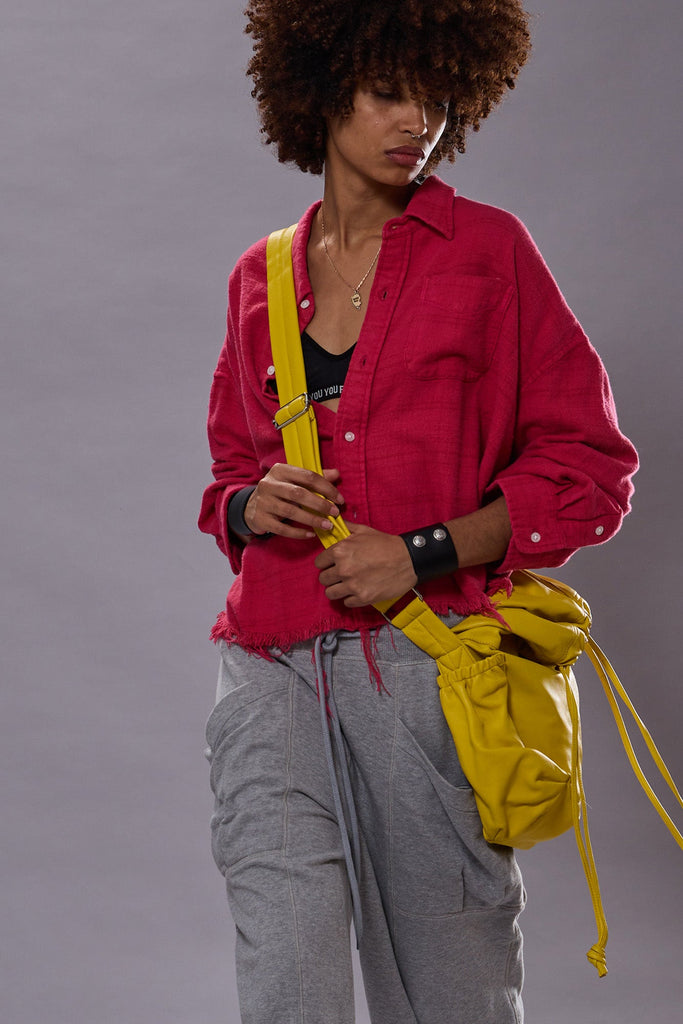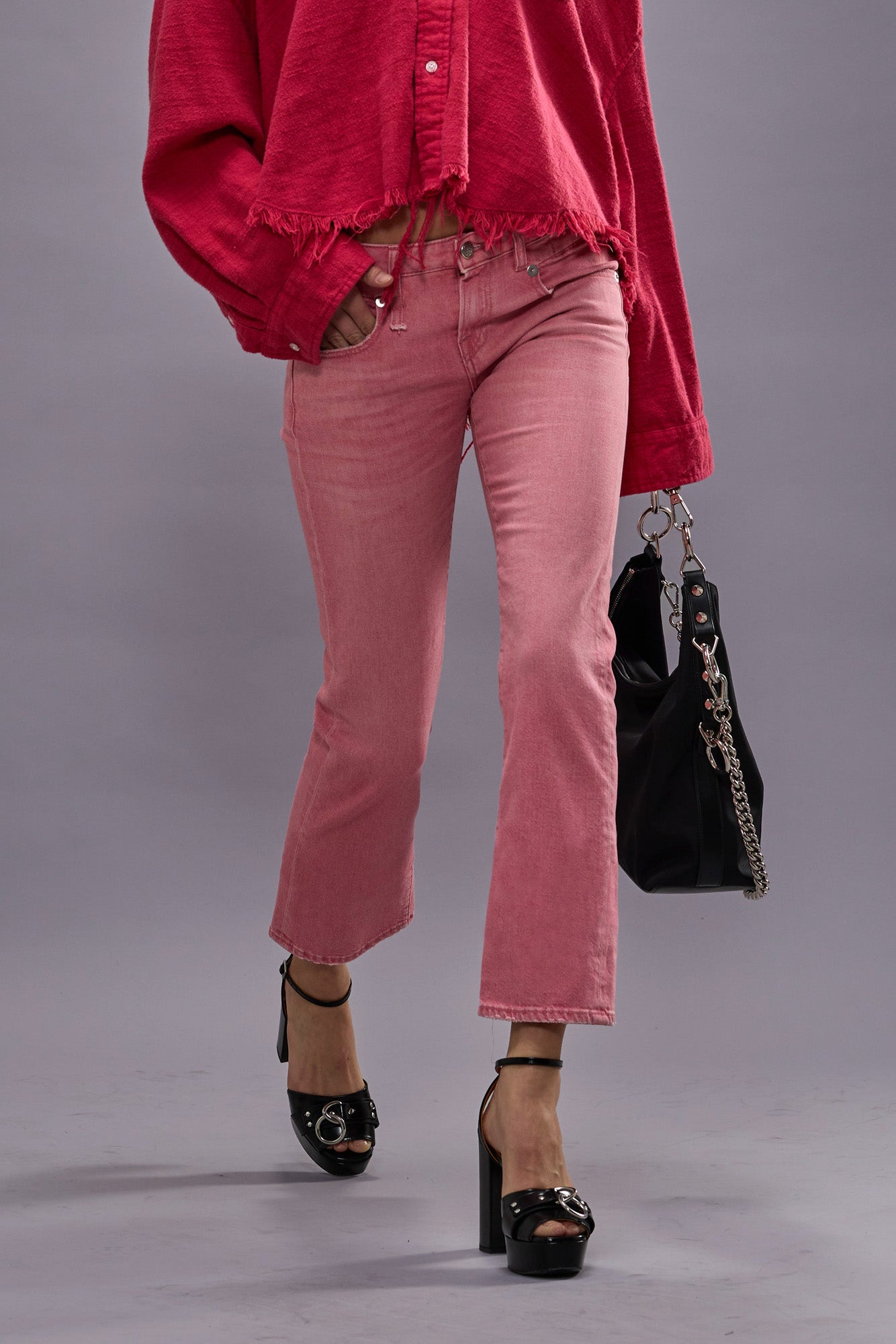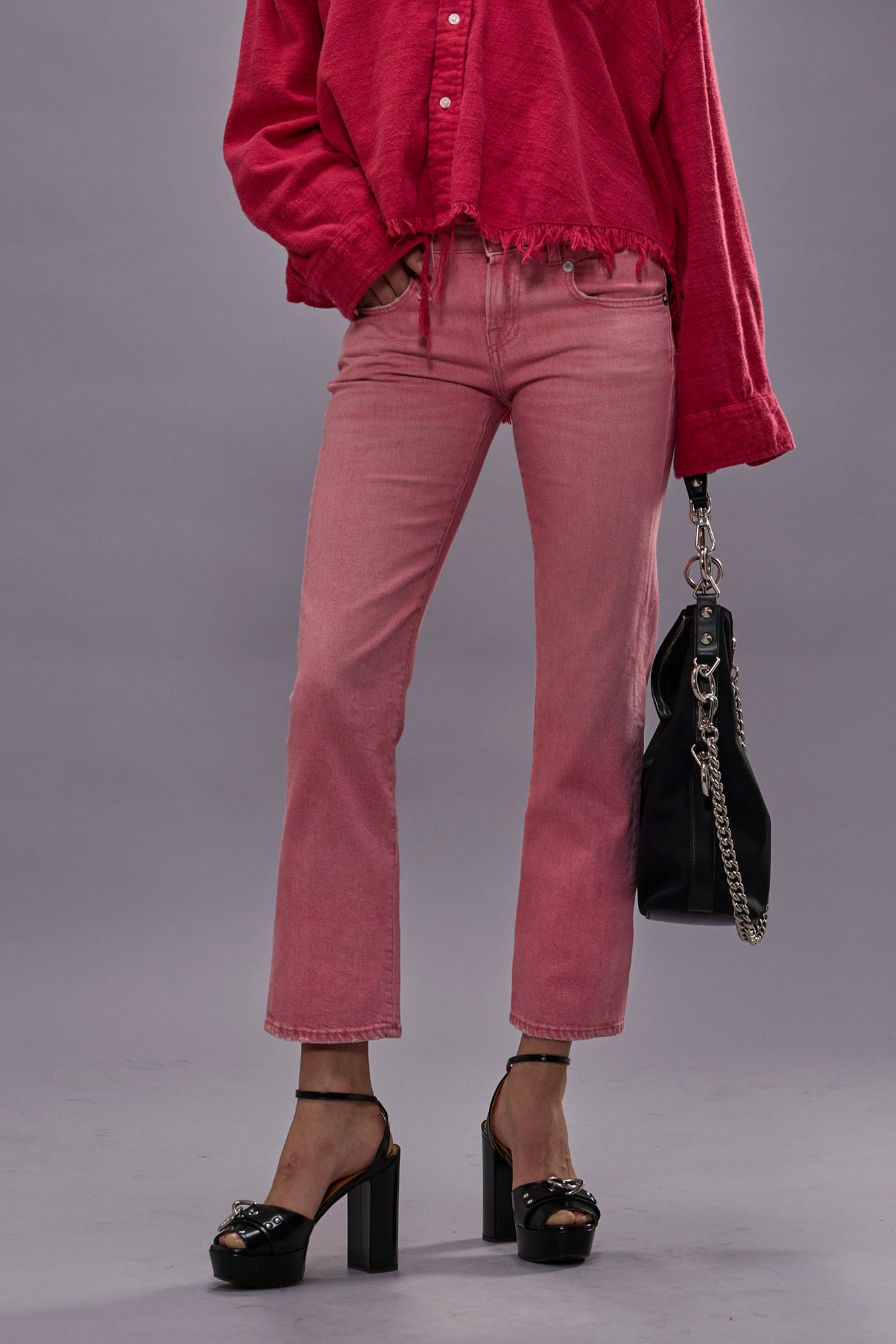 R13's iconic slim fit Boy Straight featuring a low rise and slim straight cropped leg. Built with 12 oz. pink stretch denim.