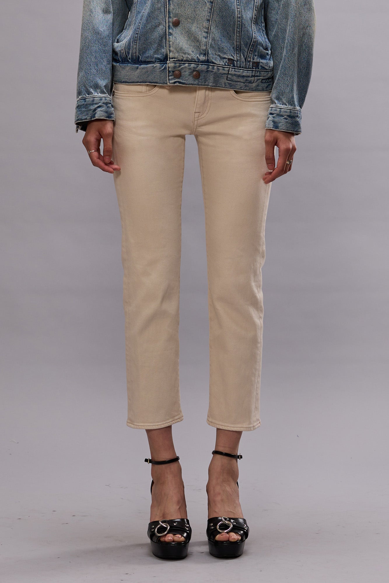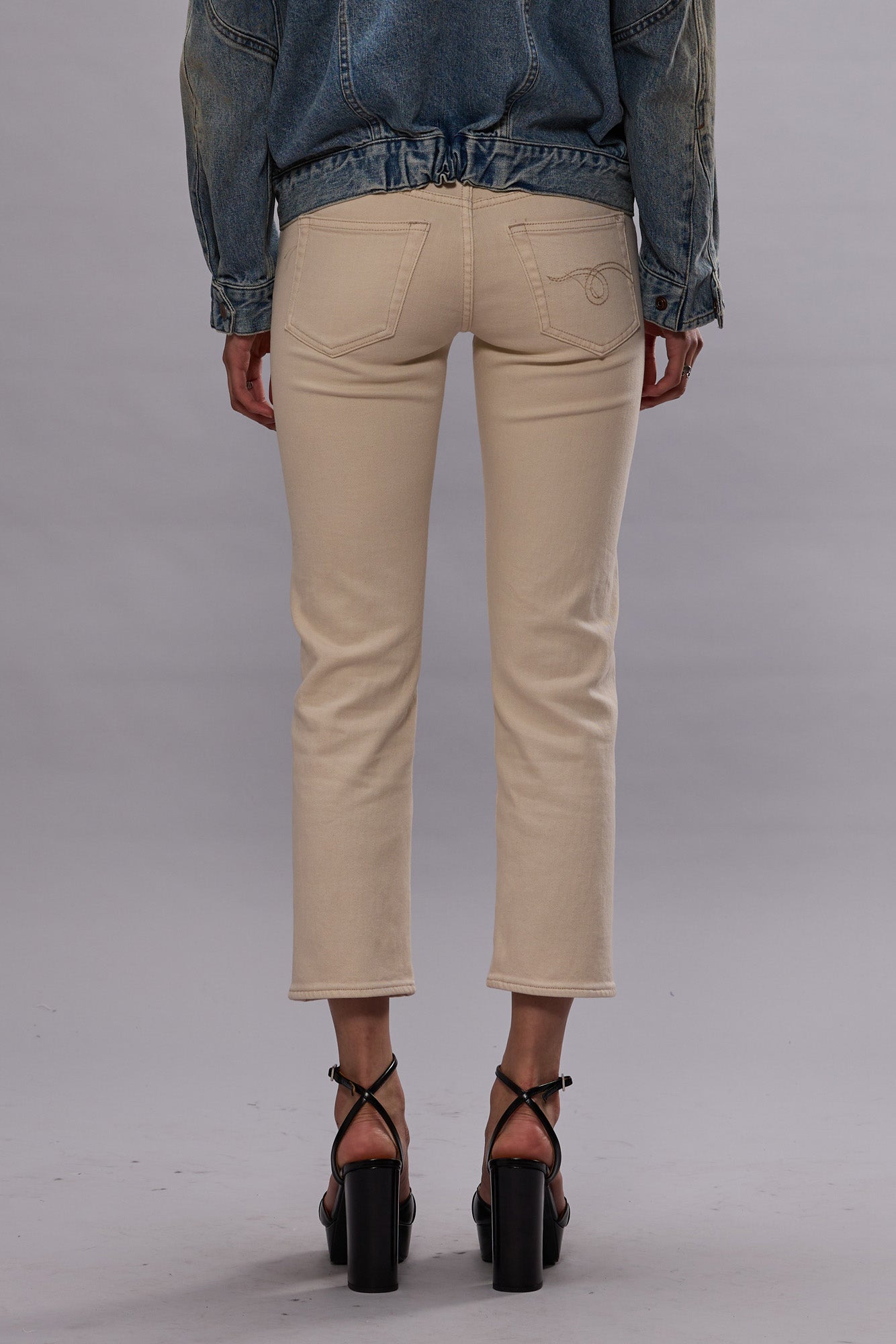 R13's iconic slim fit Boy Straight featuring a low rise and slim straight cropped leg built with comfort stretch Ecru Japanese denim.