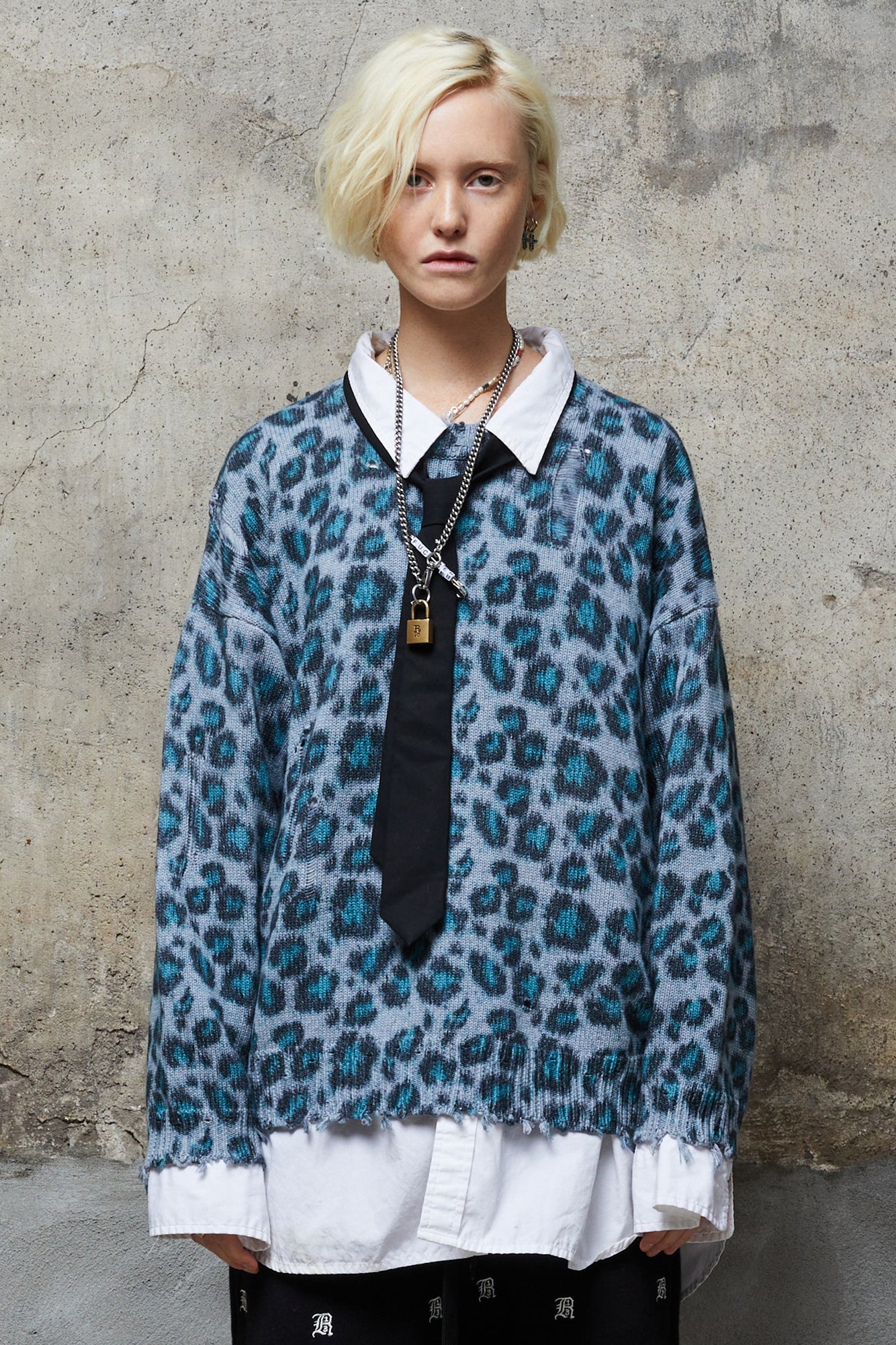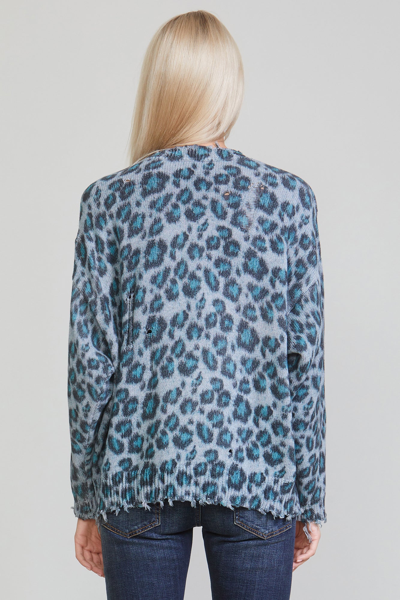 Oversized sweater featuring a blue leopard print. Distressed along the sleeves and hems.