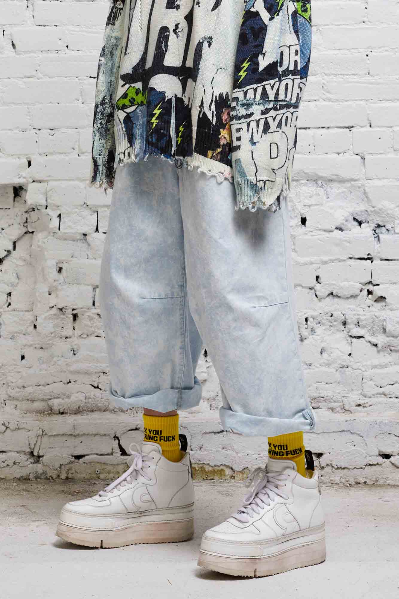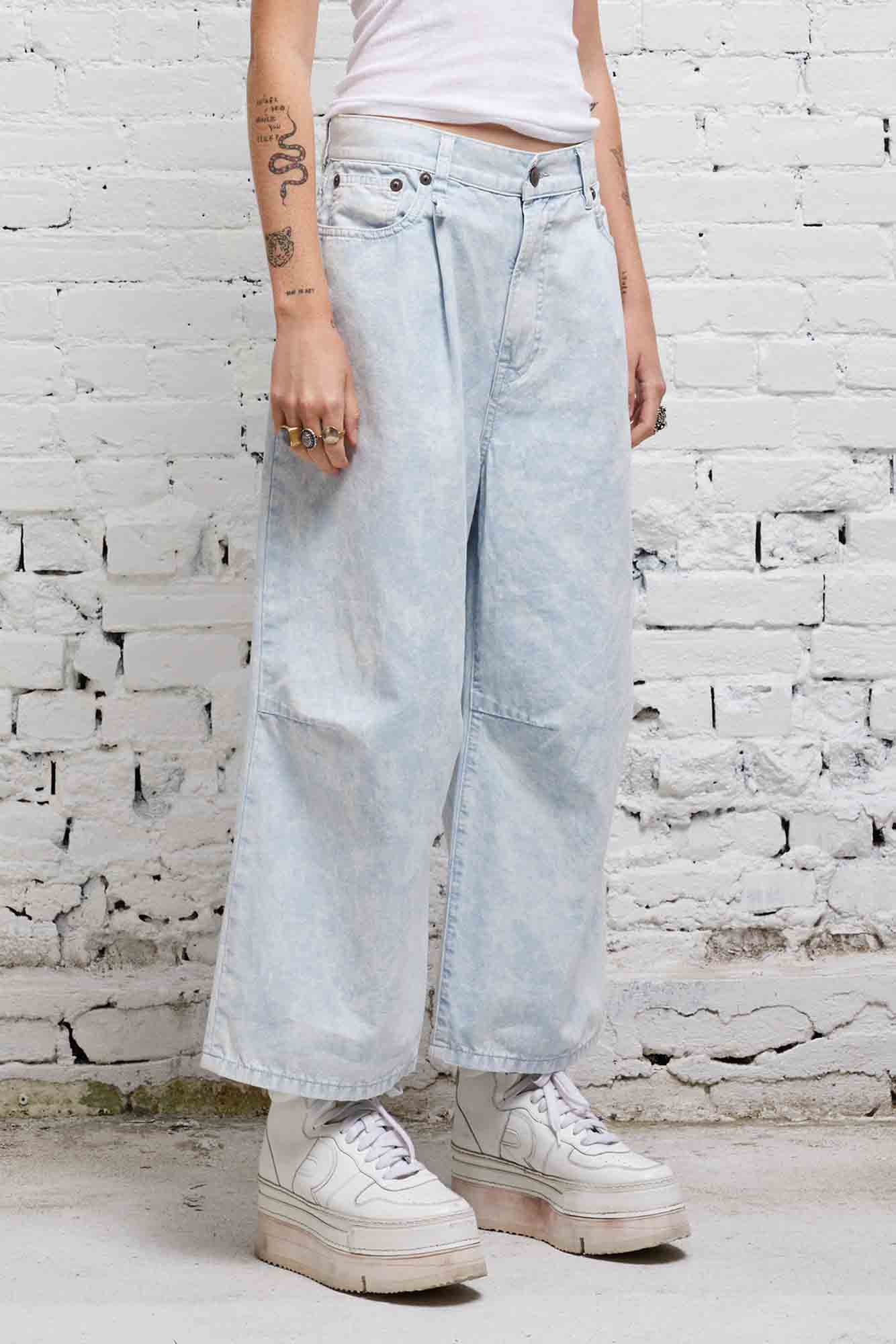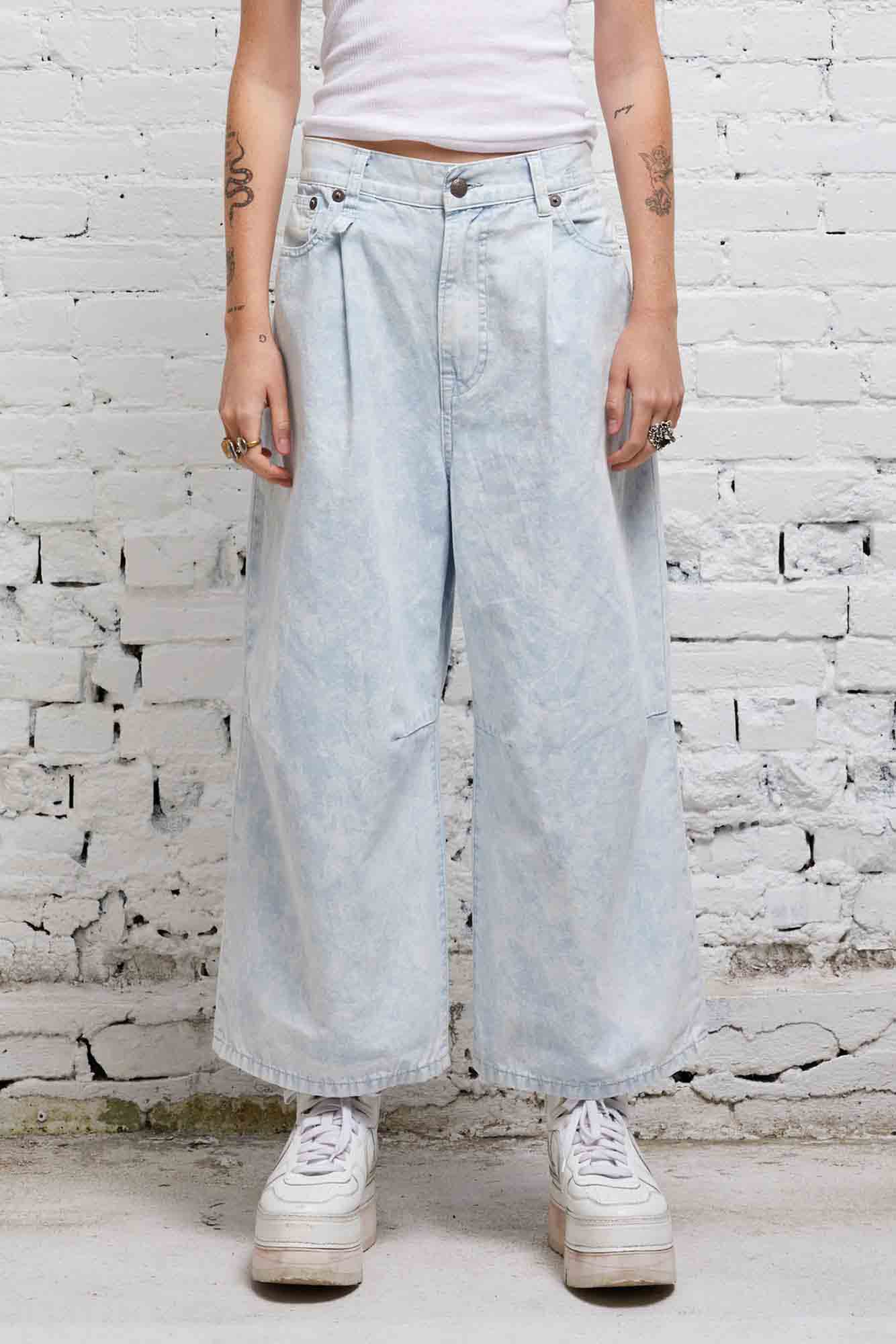 Cropped wide leg 5 pocketed Jean featuring a pleated waist, darts at the knees and a blue garment dye.