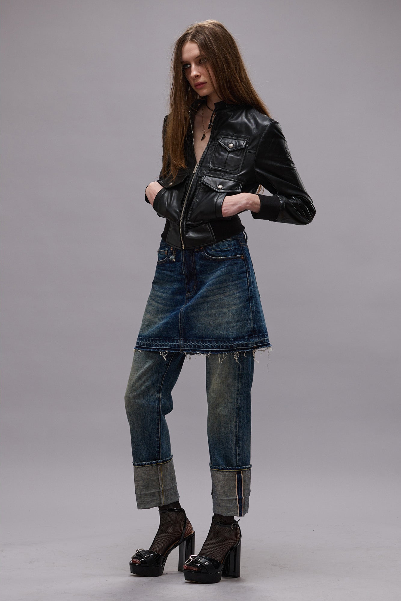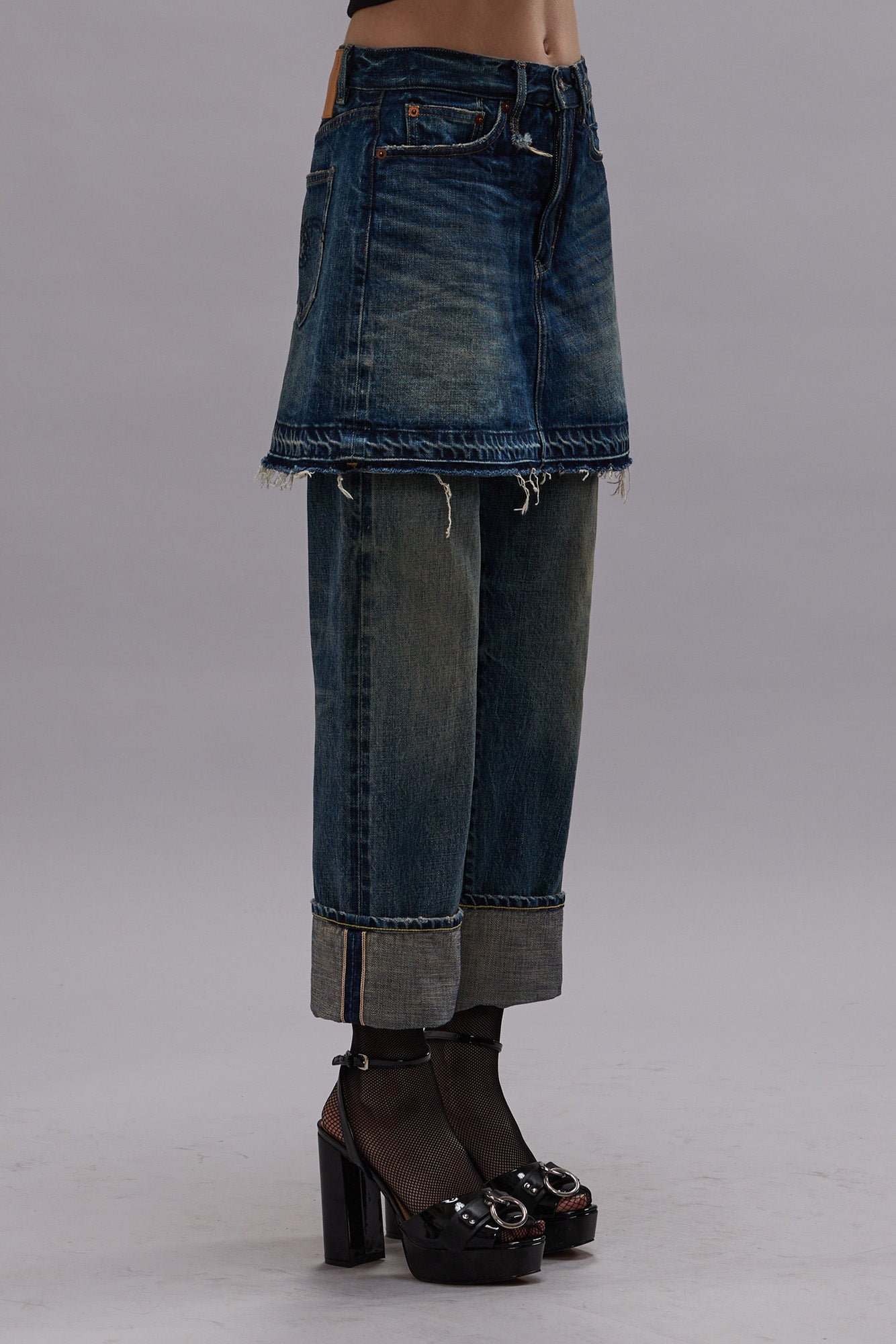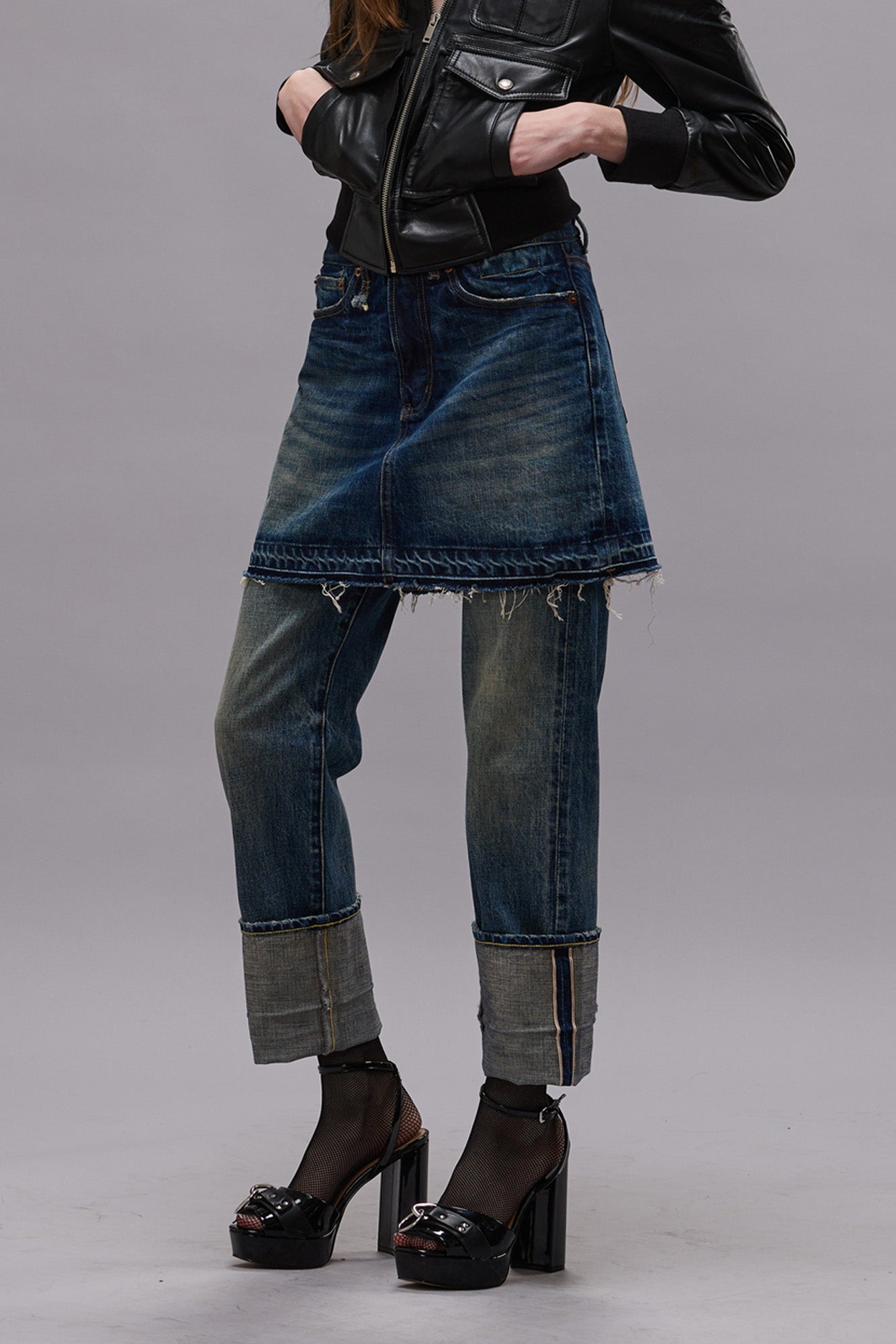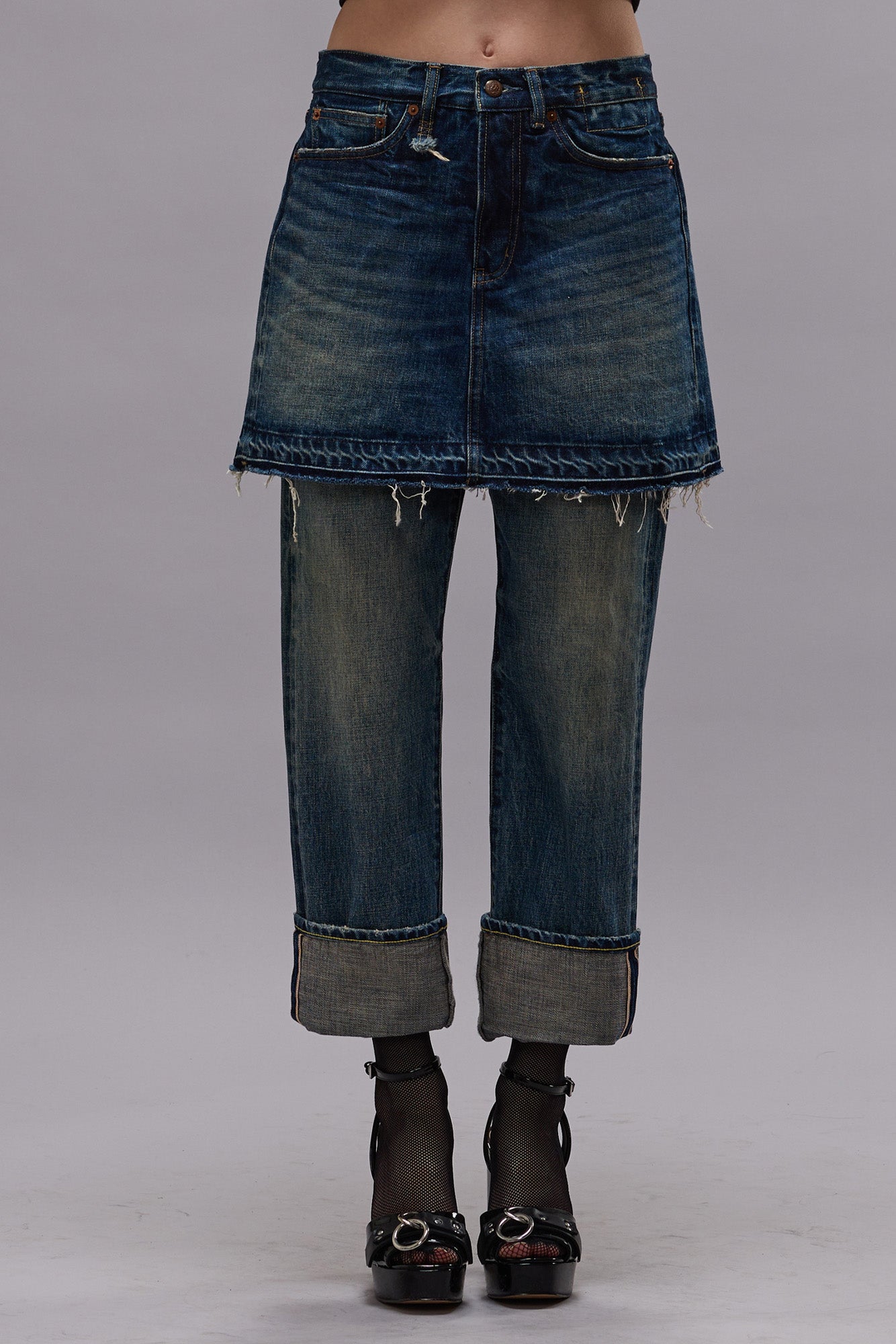 The double classic jean, featuring a denim miniskirt over the Romeo jean. Built with R13's finest selvedge denim, with a horsehide patch, exclusive brass trims and numbered interior production label.