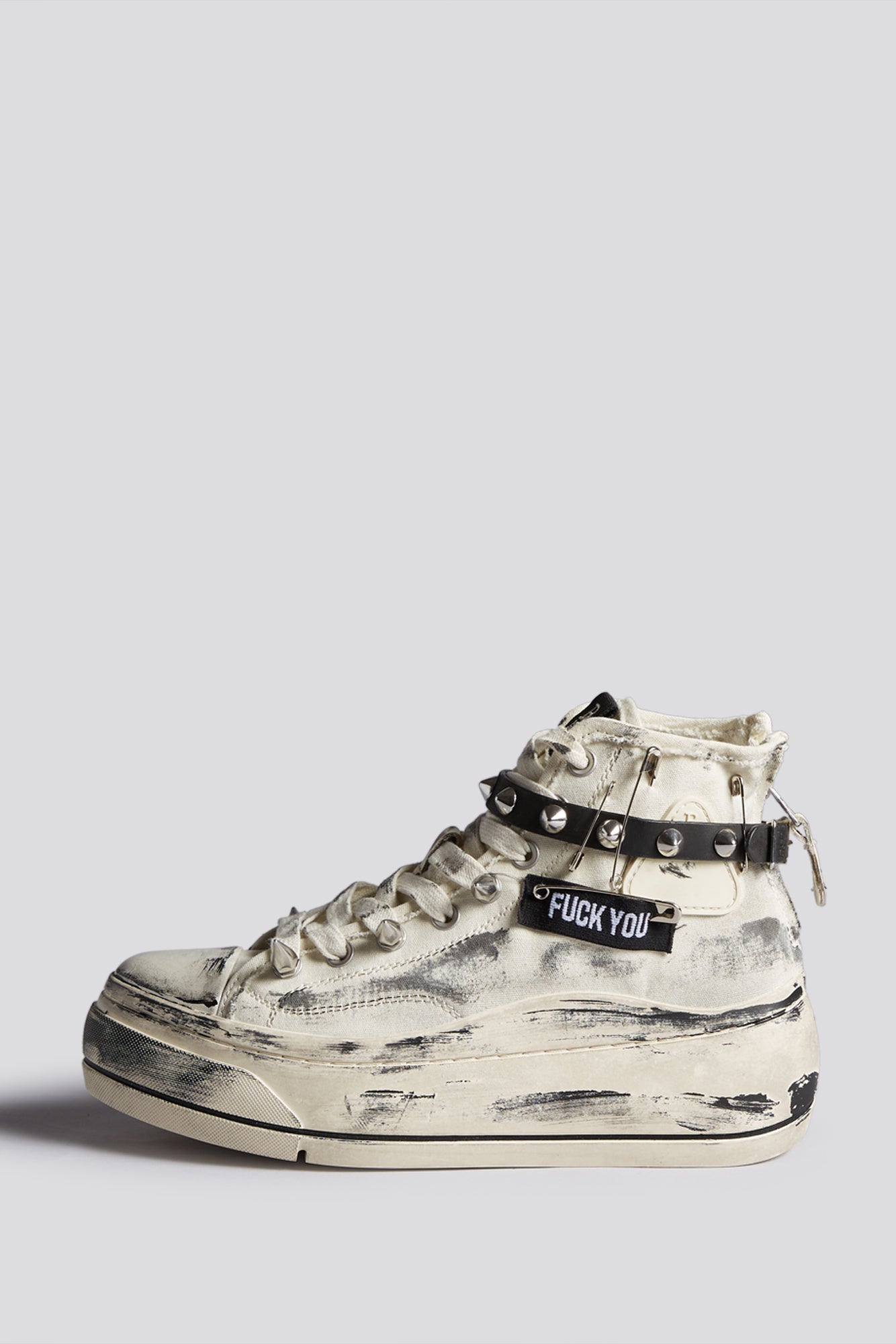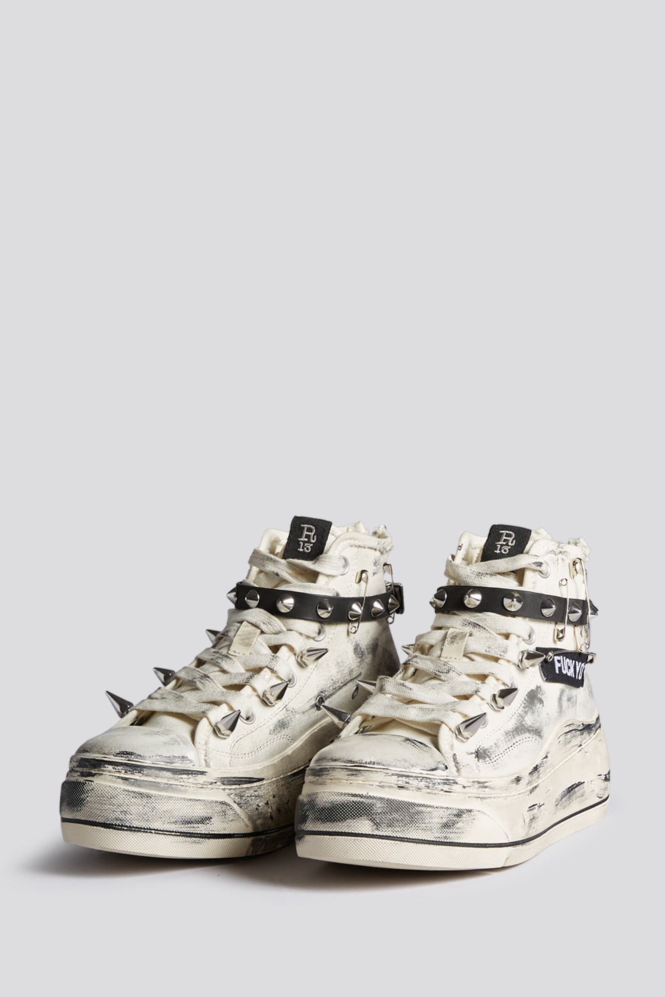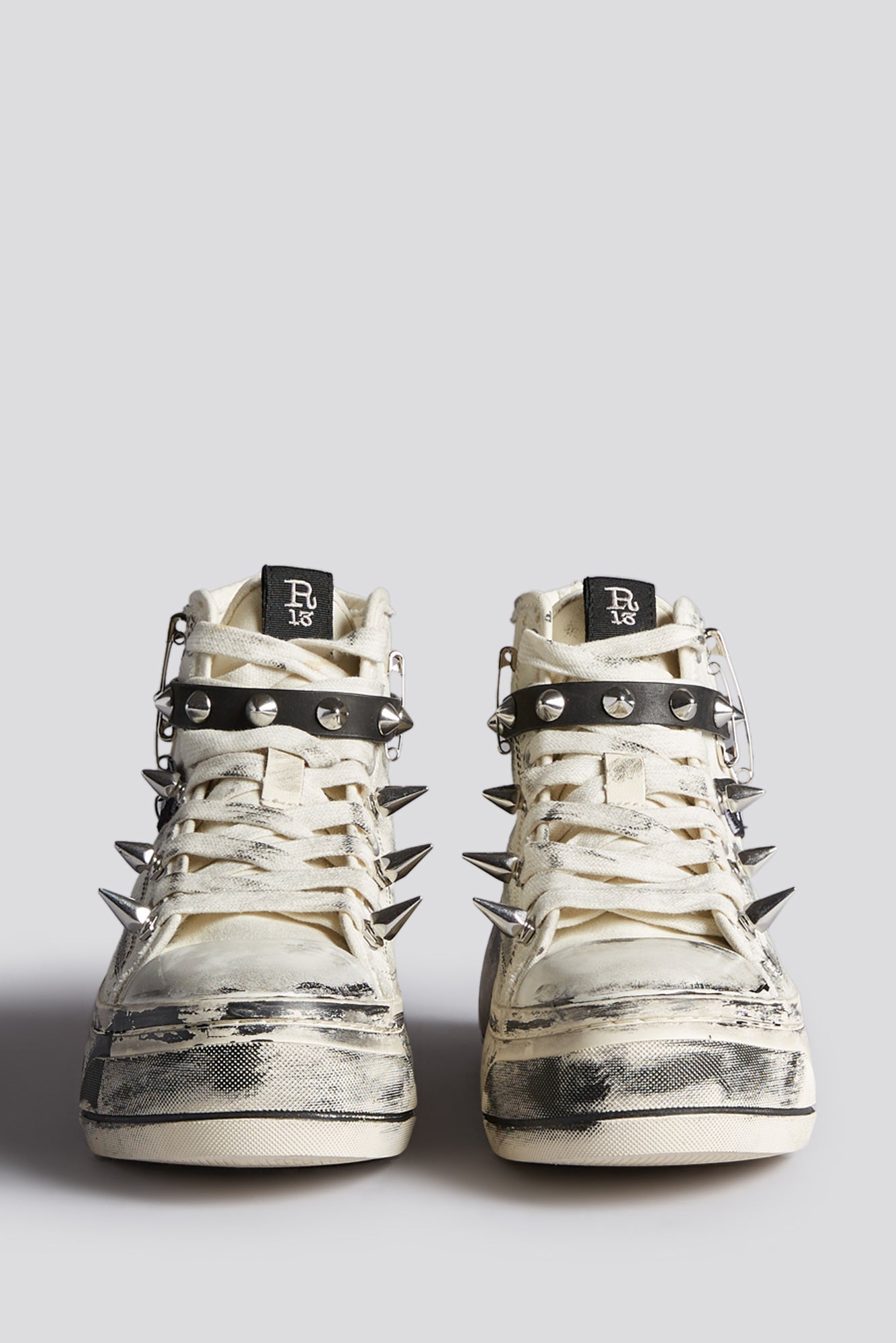 Heavily embellished Kurt High Top sneakers featuring studded grommets, safety pins and a leather belt around the ankle.