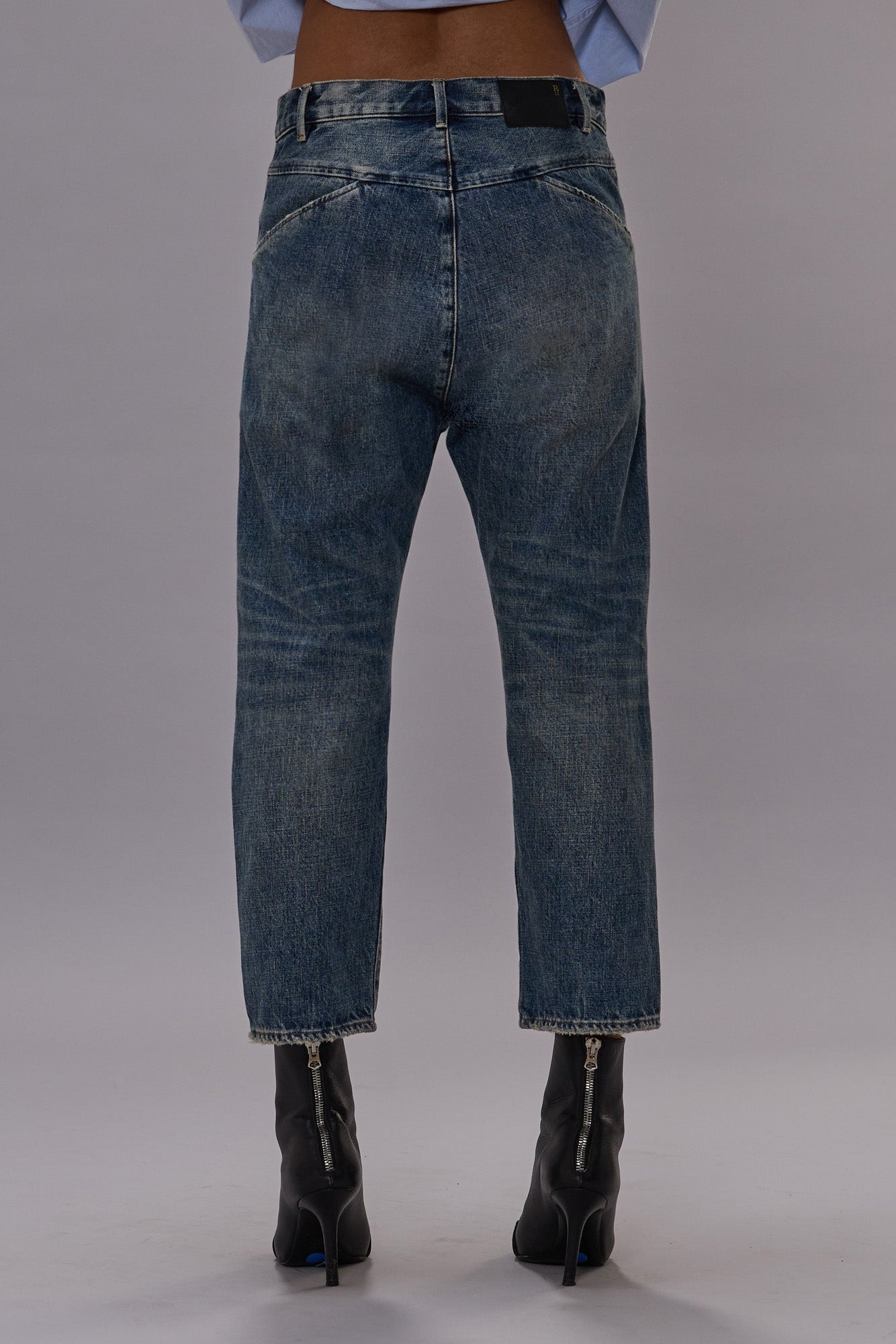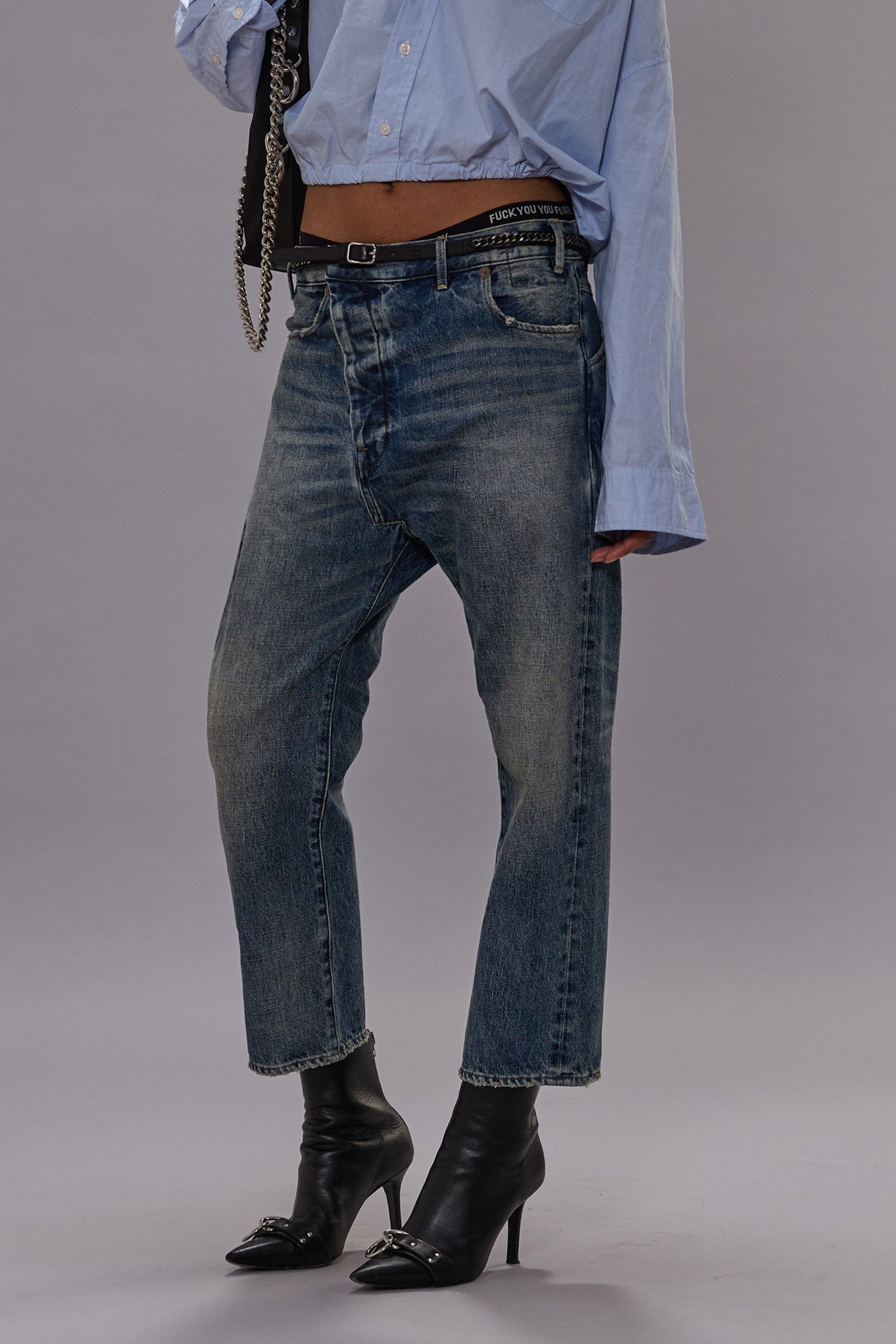 The Exene Jean is a spin on R13's Tailored Drop Jean, featuring a skewed fly closure. Built with mid-weight Japanese rigid indigo denim and treated with a medium indigo wash and mild wear pattern.