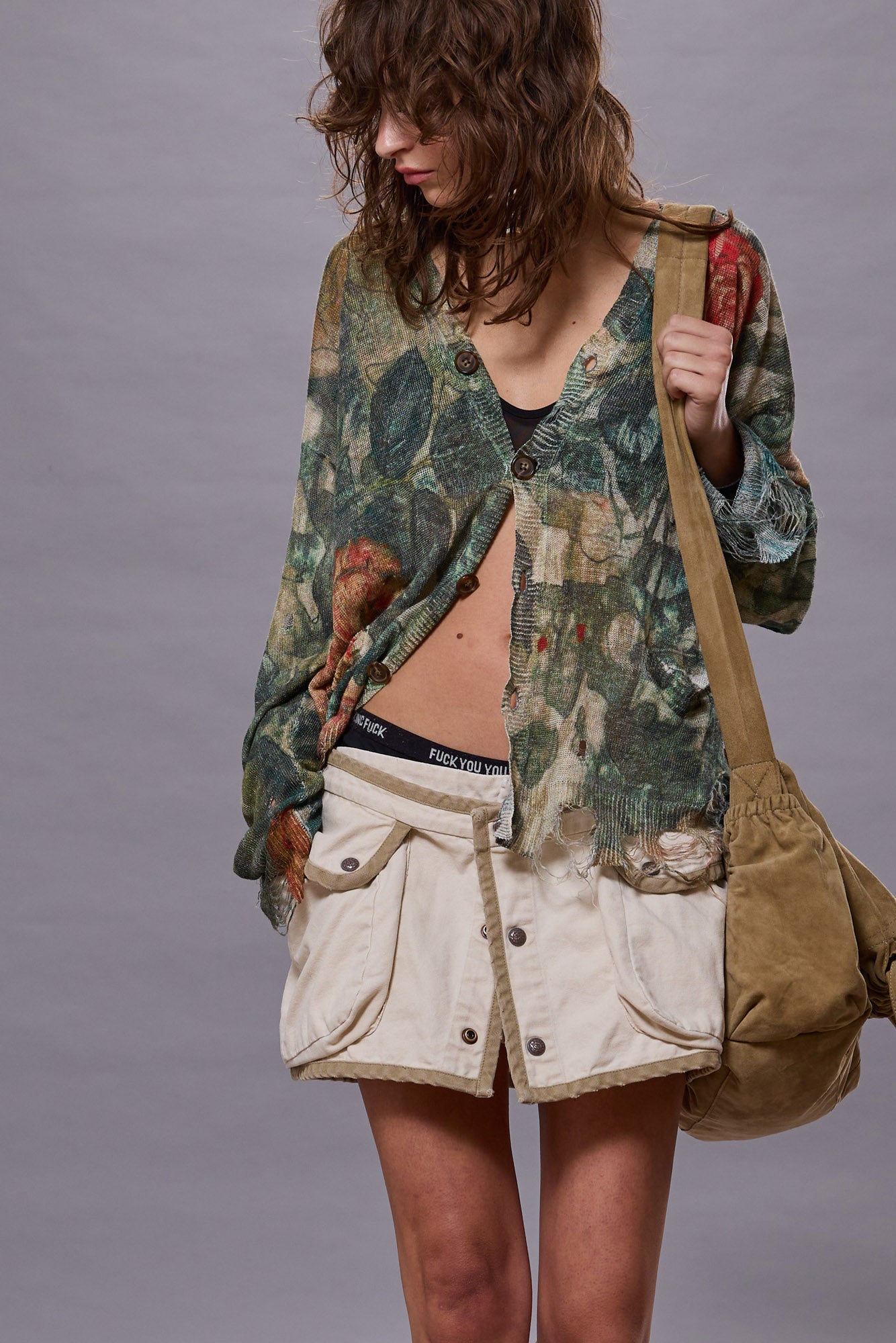Relaxed fit linen cardigan featuring heavily distressed edges and a camo rose print.
