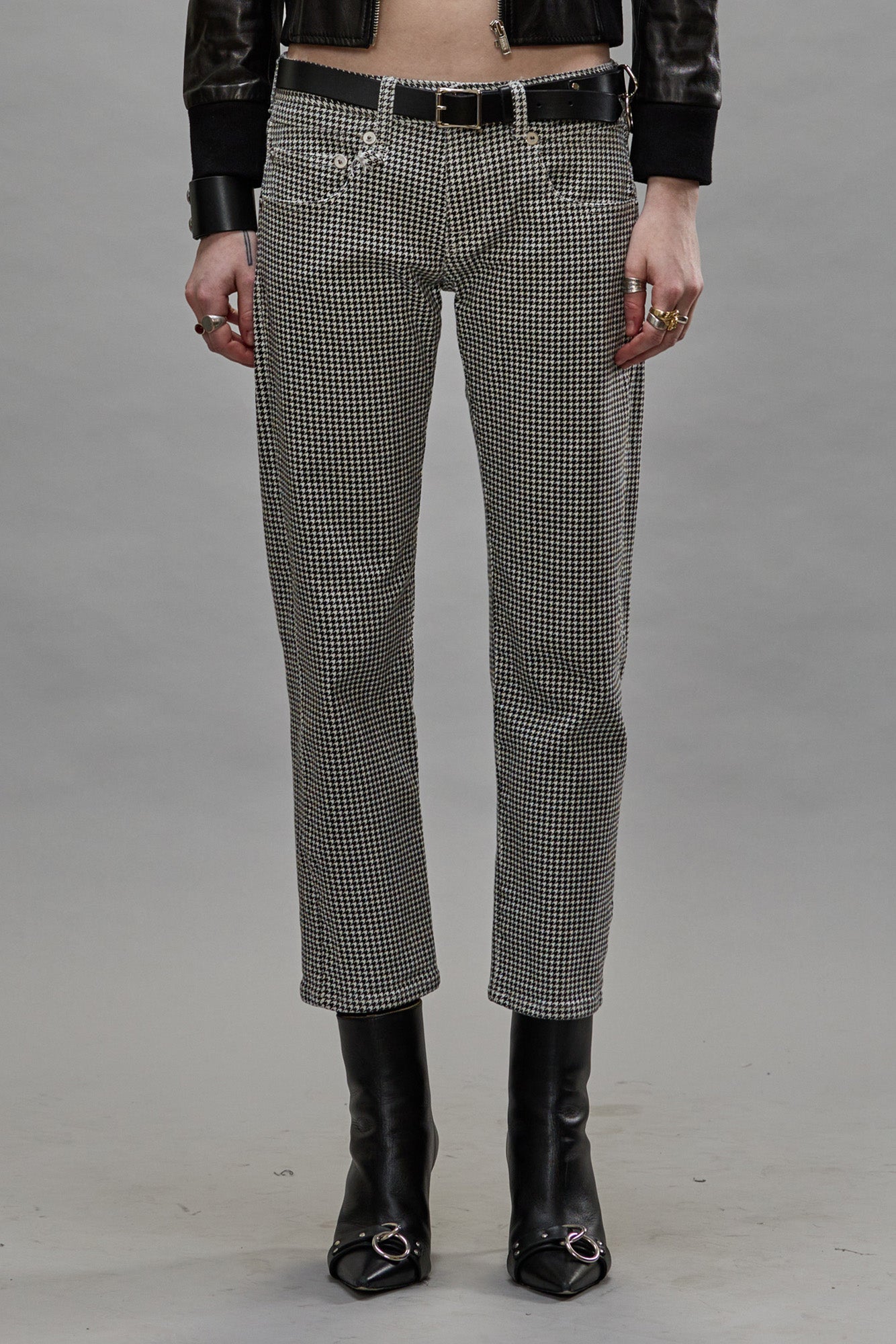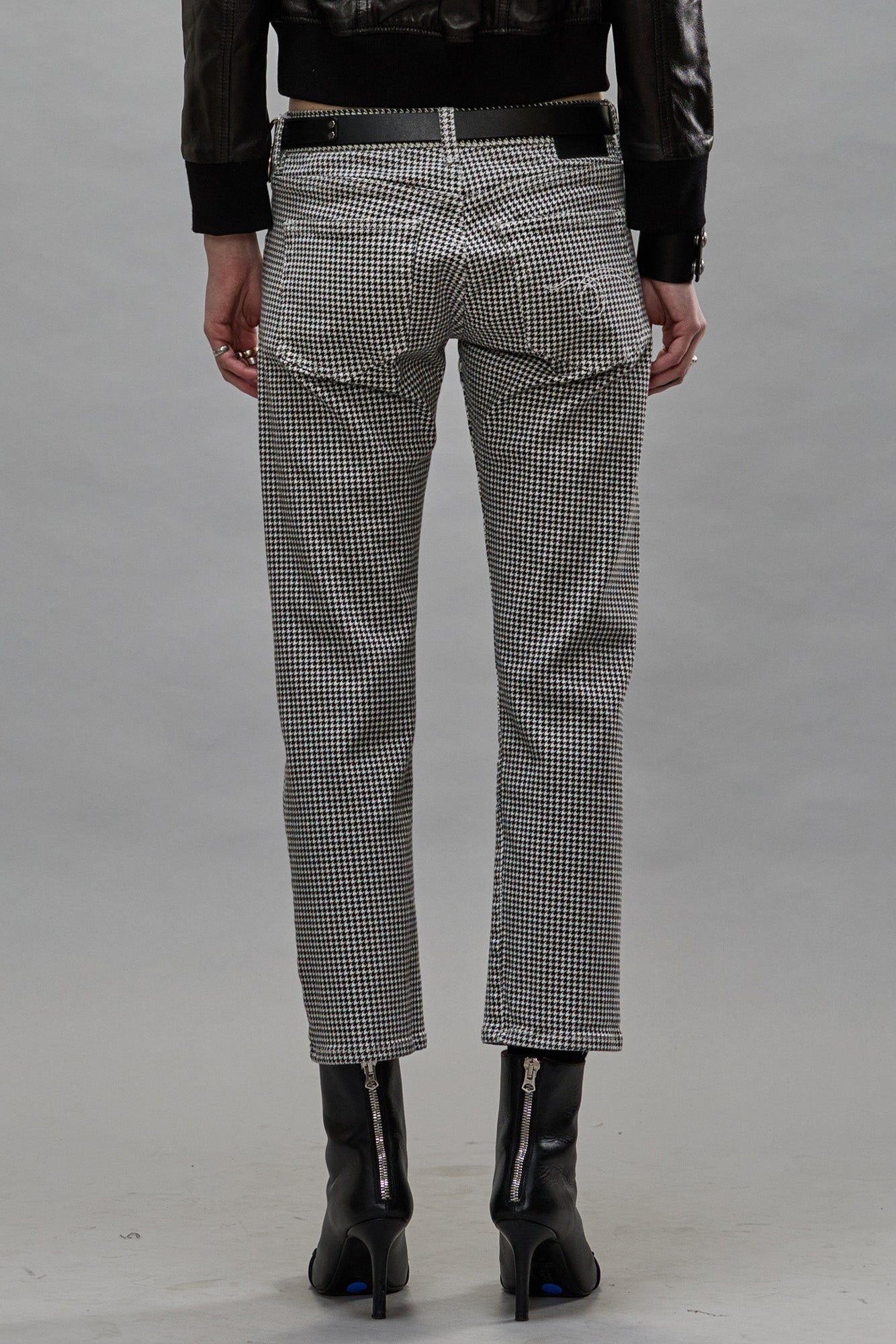 R13's iconic slim fit Boy Straight featuring a low rise and slim straight cropped leg. Built with printed Japanese houndstooth denim.