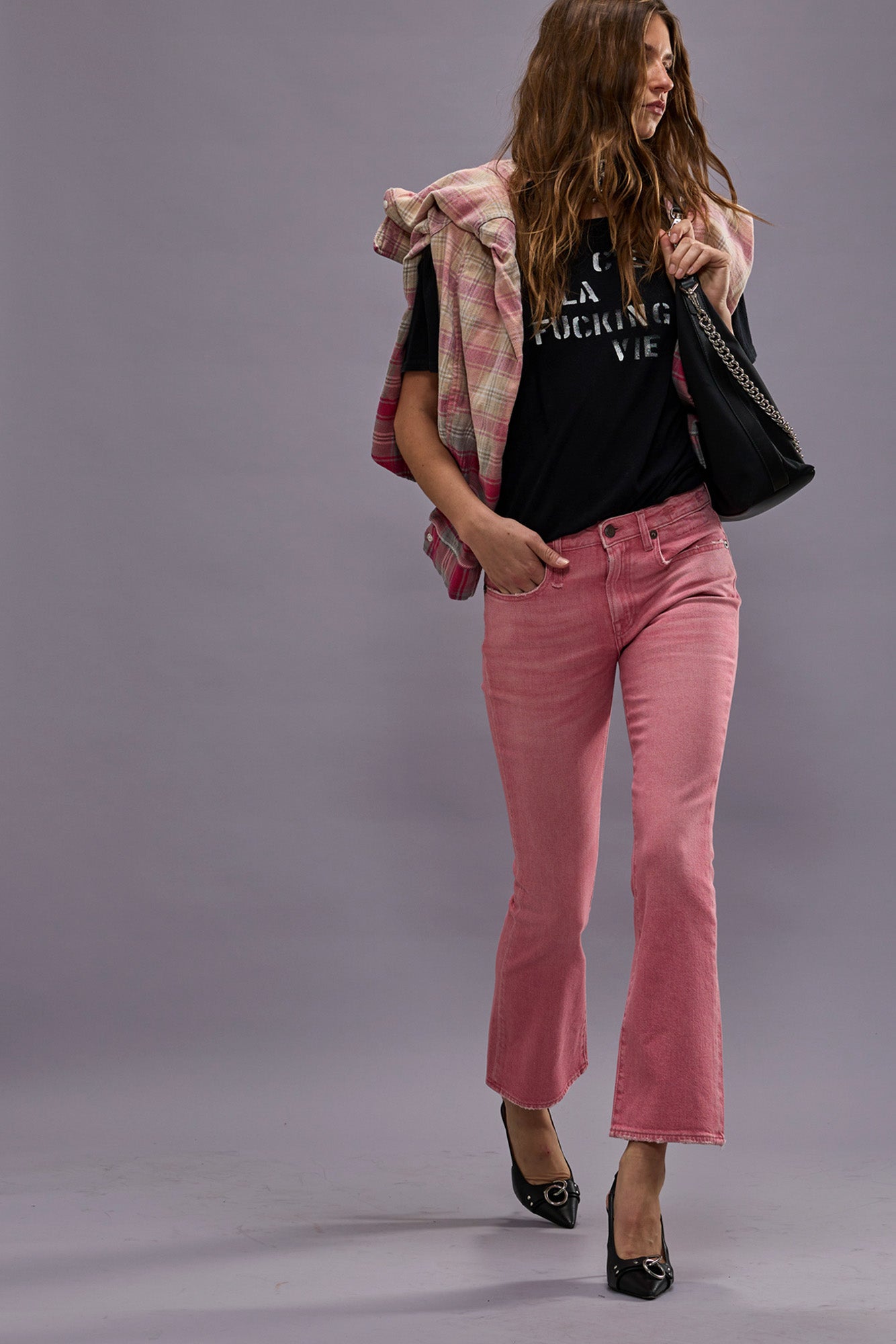 Slim straight cropped jean with a subtle flare built with 12 oz. pink stretch denim.